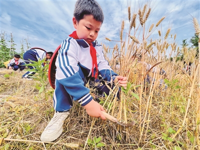 “科学课上有搭塔实验,测试承重和抗风能力,我们让学生用麦秆搭塔。此外,我们还带领学生探究各种农具中的科学原理。比如脱粒时不断上下扬落簸箕,较轻的杂质会被‘吹’出簸箕,这就涉及空气涡流的原理。”傅伟平告诉记者,学校的“野心”不止于通过一粒麦子实现美育、劳育,教师们正探索将“麦子”融入各学科教学,融入德育建设,实现“一‘麦’相承,以‘麦’育人”的目标。