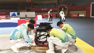 杭州第4届亚残运会开幕在即,轮椅击剑项目的比赛将在杭州电子科技大学体育馆举行。连日来,志愿者们认真参加岗前培训,熟悉服务流程。图为志愿者在调试竞赛轮椅。