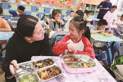 杭州市人民小学每周向学生和家长征求意见,按照学生喜好和成长需求推出品种多样、营养丰富的午餐,同时还请家长代表定期来校陪餐,监督学校午餐管理。该校获评杭州市首批营养健康食堂示范单位。图为10月31日中午,家长代表在教室陪餐。(本报记者 高亦平 摄)