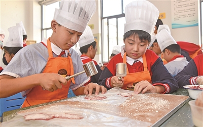 近日,仙居县安洲小学举办“地域特色美食进课堂”劳动实践活动。图为学生在教师的指导下学习制作当地美食“敲敲肉”。