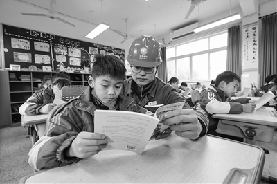 1月22日,德清县下渚湖街道联合国网浙江德清县供电有限公司在该县三合中心学校上了一堂安全课,帮助学生提高安全用电和节约用电意识。图为供电公司志愿者在指导学生阅读《安全用电》漫画书。(本报通讯员 王 正 摄)