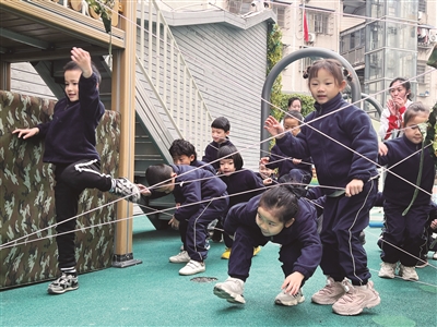 温州市第四幼儿园一直致力于研究开发情境体能活动课程,在体能活动中梳理出零教具(身体)、One教具(一物多玩)、原教具(大型滑梯、攀爬架)、旧教具(废旧材料)、多教具(多种材料组合)等样态。近日,该园以健康节为契机开展教师优质课评比活动。图为中班情境体能活动“穿越封锁线”,教师利用弹力带设置关卡,着重落实幼儿跨、钻、爬等动作技能。
