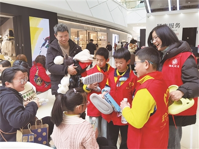 3月1日,“浙江省最美志愿者”劳仁元来到海宁经济开发区实验小学,开展学雷锋公益服务事迹宣讲活动。学生们不仅聆听了劳仁元对雷锋精神的解读,还在他的带领下开展公益爱心义卖活动,并将所得收入捐赠给公益组织。图为学生在商场进行义卖活动。
