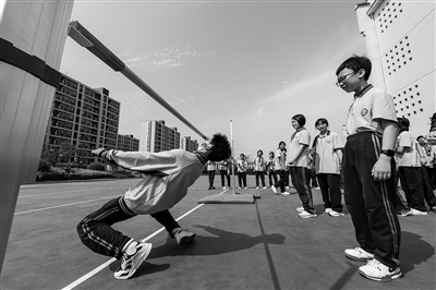 连日来,金华市丽泽中学开展了丰富多彩的校园吉尼斯活动,包含平板支撑、“金鸡独立”、投篮、过低杆、颠球等项目,让学生们在趣味游戏中增强体质、健康成长。图为过低杆比赛现场。(本报通讯员 胡肖飞 摄)