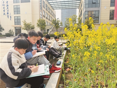 阳春三月,春暖花开。杭州市三墩小学双桥校区内春意盎然,劳动实践基地的油菜花欣然开放。美术教师将课堂搬到了室外,让学生近距离观察油菜花,深入探究油菜花的形状、结构、色彩,并以明信片的形式写生,借用油菜花的花语传递春天的力量。