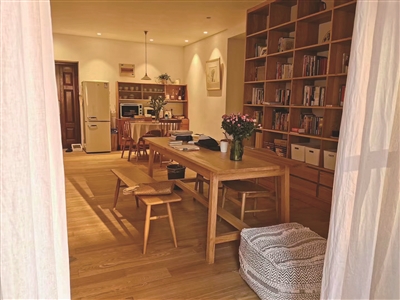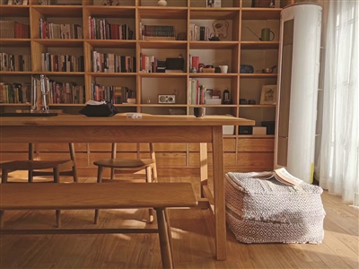 我将客厅改造成书房,用一整面墙做书柜,樱桃木色是还原了记忆中父亲做的那个书架的颜色。书房中间放置一张同色系的桌子,搭配两把椅子和一个长条凳子,森系沙发靠着另一面墙。这个集读书、用餐、会客等功能于一体的书房,是我每天在家里待得最久的地方。