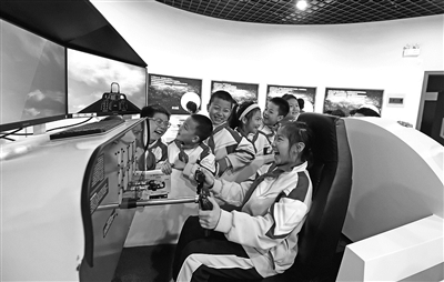 4月12日是世界航天日,仙居县实验小学开展“逐梦航天”主题教育活动。图为学生在学校科技馆操作飞行驾驶模拟器。(本报通讯员 王华斌 摄)