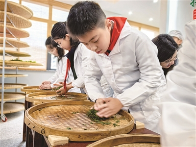 近日,来自上海尚阳外国语学校桐乡实验学校和嘉兴市茶园小学两所学校的学生,来到开化县城东小学,开展跨地区教共体师生线下交流活动。最令两校学生记忆深刻的,是城东小学茶园文化研学基地里的龙顶绿茶制作课程。学生们不仅从中体验了采茶、制茶、泡茶、点茶,还将自己制作的茶叶带回家,与父母一同分享。图为学生正在专注地揉捻茶叶。(本报通讯员 刘建民 摄)