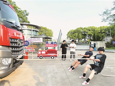 近日,衢州职业技术学院举行校园千人拔河活动,涵盖百人拔河对抗赛、趣味力量挑战赛等项目。该校现开设有拔河选修课,并将其纳入休闲体育等专业的培养计划。图为学生在进行拖消防车比赛。