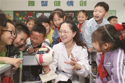 6月6日是第29个全国“爱眼日”,湖州市吴兴区埭溪镇上强小学联合中心卫生院开展爱眼护眼主题教育活动。图为医生正在为学生介绍眼球构造,普及科学用眼知识。