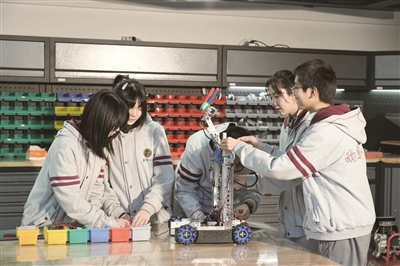 当记者走进课程基地里的智造社和创做坊时,一批高一学生正在合作制作小车。“除了马达,其他零部件都是学生自己设计再用数控铣床或者3D打印机加工出来的。”学校信息中心副主任顾晓春告诉记者,“究竟怎么样的小车在转弯时车身更灵活、在对抗时结构更加稳定扎实,学生可以结合所学的物理知识,在这里一点点摸索,眼见为实。”