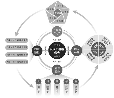 为充分发挥办学理念、校训在学校教育教学中的引领作用,使之深入全体师生心灵,渗透到全体师生的学习、生活的方方面面,同时围绕打造现代化区域名校的办学愿景,学校构建出的“成·长”素养化课程体系,探索出的“生·长”思维型课堂,实施的“筑·长”发展性评价,推进的“相·长”书院式研训,以及围绕五育养“力”积极开启的“五节联动”,在“凌峰踏潮·敬贤争长”党建品牌引领下,形成了“埠上开花·养贤助长”德育品牌、“林下追光·适贤茁长”体育品牌、“溪中点墨·颐贤滋长”艺术品牌,为落实培养有理想、有本领、有担当的新时代“三有”新贤育人目标创设载体提供了抓手,使学校的育人体系能有效渗透、落实到教育教学中。