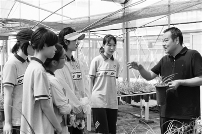 日前,绍兴市第一初级中学龙山校区学生来到位于绍兴市柯桥区漓渚镇千亩兰苑参观,只见一个个现代化大棚科技感十足,配备了自动控温控湿、自动喷淋、自动遮阳系统等,真正实现了科技育兰。图为兰苑主人赵虎向学生介绍最新的育兰技术。(本报通讯员 姜小蓉 摄)