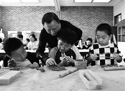 日前,义乌市义亭镇义亭小学和畈田朱小学的9名学生来到杭畴小学,欣赏杭畴小学师生制作的陶艺制品,体验陶艺笔筒制作。据悉,这是义亭镇小学教育共富体组织的跨校联动活动。图为杭畴小学教师指导义亭小学学生做笔筒。
