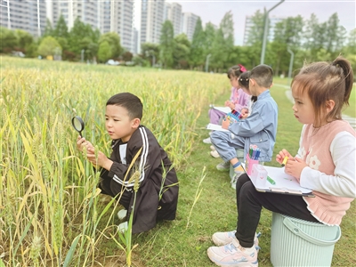 近年来,杭州市临平区星桥幼儿园融家园社三方资源打造“星家文化大草坪”无边界游戏空间。幼儿园组织20个班级的幼儿轮流到大草坪运动、做游戏或开展家园活动。图为幼儿们在大草坪观察小麦的生长情况。