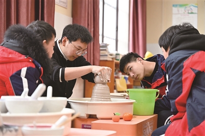 ②衢州市特殊教育学校师生一起制作陶艺作品。
