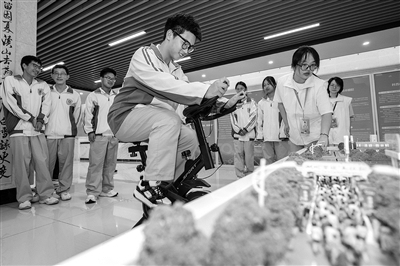 6月23日至29日为全国节能宣传周。长兴县开展节能低碳主题宣传进校园活动。国家电网湖州供电公司的“碳达人”志愿者利用城市沙盘,为长兴县职业技术教育集团雉山校区学生科普绿色低碳常识和相关节能知识。图为学生体验绿色单车骑行。