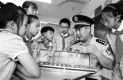 在“6.26”国际禁毒日来临之际,台州市路桥区公安、检察、团委等部门深入校园,开展青少年禁毒教育活动。图为路桥区桐屿派出所民警走进路桥区外国语小学向学生宣传禁毒知识。