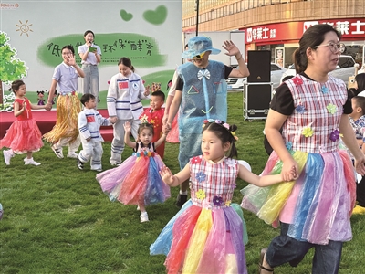 近日,开化县芹阳幼儿园举办“低碳生活,环保‘酵’育”主题活动。活动设置环保知识竞答、酵素制作体验、绿色兑换市集等环节,依托家校社联动模式,生动传递绿色低碳理念。图为活动现场,身着废旧材料创意服饰的亲子组合正在展示环保作品。