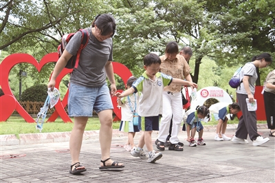 近日,江山市江东科技幼儿园开展第三届公园项目节,12个班级围绕公园里的石狮、屋檐、瓦片等10余种观察对象开展项目活动。一些活动成果以作品形式在公园展示,与游客分享。活动之余,家长和幼儿一起玩起了亲子小游戏。图为家长与幼儿用脚背“护送”小石头。