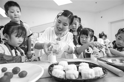 9月24日,德清县阜溪实验幼儿园开展“学做月饼迎中秋”活动。图为师幼一起制作月饼。
