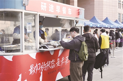 上周末杭州气温虽低,但各高校考点细致周到的暖心举措,为考生们驱散了寒意,带来了一股暖流。21日早上7点多,杭州电子科技大学设置的“研途早餐车”前已排起了长队,不少考生一边等候,一边低头翻阅资料,抓紧考前最后的时间复习。“我家住在老余杭,早上过来要1个小时,昨天只准备了面包,今天有经验了,可以吃口热乎的。”社会考生吴霏告诉记者。