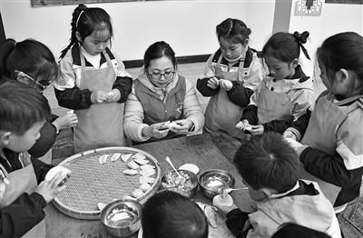 冬至前夕,仙居县白塔镇第一幼儿园党员教师和幼儿一起为辖区内留守老人包饺子。图为活动现场。