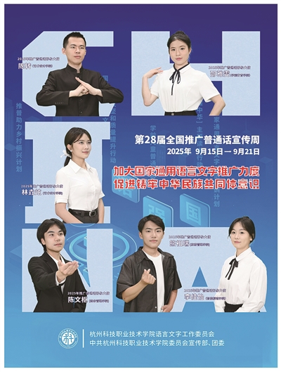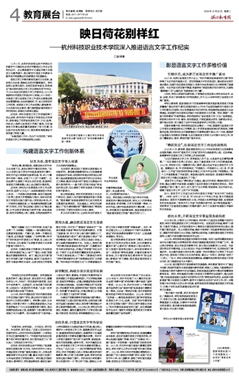 近年来,杭州科技职业技术学院以“经典教育深化资源共享”为方向,与杭州多所中小学合作建设语言文字推广基地共建站(点),共享优质课程资源与专业师资力量,截至目前已发展了16所省级语言文字特色学校。学校通过开展师资培训、教学研讨、项目建设等活动,推动区域中小学校园语言文化建设的高水平发展;通过深入调研中小学语言文字工作,跟踪教师的专业成长,配套语言特色发展指引,显著带动了区域国家通用语言文字教育质量的整体改善。杭州中小学语文课堂的“语文味”日益浓厚,诵读经典、规范书写深度融入教学日常。杭州市富阳区实验小学将语言文字工作与校本课程有机融合,开发出“‘达夫三社’——我们的精神家园”特色项目;杭州市钱塘区云帆小学强化教师诗词讲解教学,精心打造“云帆诗教”品牌,使学生的语言表达能力得到了提升。杭州师范大学附属中学从校园内的一片“梦之林”开始,提炼出25年新疆班实践铸牢中华民族共同体意识的文化浸润品牌。