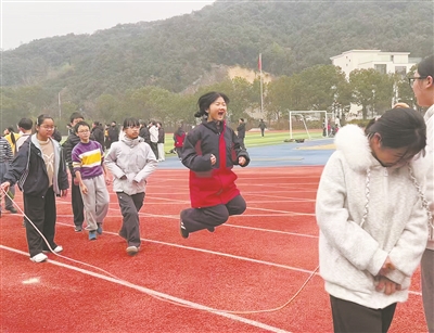 当天大课间,在袁林的带领下,701班学生在操场上跳长绳。陈淅与黄思菡一前一后,轻盈地钻入翻飞的长绳中。每一次成功跃过,笑容便如花儿般在她们脸上粲然绽放。