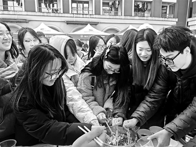 近日,浙江工业大学之江学院举行第五届之江捕鱼节。活动设有开捕仪式、“家乡鱼”厨艺大赛、鱼宴分享等环节。其中,各院系选派选手参加“家乡鱼”厨艺大赛,现场烹饪家乡特色鱼。图为观众争相品尝,以投票决出胜者。(本报通讯员 俞陈萍 摄)