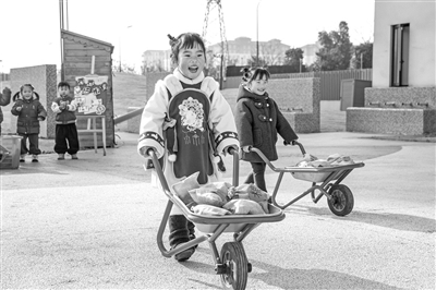 1月23日,德清县新市镇第三幼儿园开展“迎腊八”主题活动。幼儿通过认食材、做腊八粥、印福字等活动,感受中华优秀传统文化的独特魅力。图为幼儿在玩运粮食游戏。