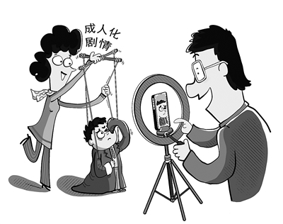 近日媒体报道,部分儿童微短剧存在将萌宝元素与重生穿越、恋爱助攻等成人化剧情强行嫁接的现象。在这类短剧中,儿童演员被安排扮演超能力者、豪门继承人等复杂角色,诠释远超其认知能力与生活经验的故事。表面上看是创意融合,实则将儿童工具化,使其沦为成人娱乐的流量工具。这种操作不仅违背《未成年人节目管理规定》,更可能对儿童身心造成多重伤害。微短剧作为新业态,绝不能触碰儿童保护红线。 (邱 炯 绘)