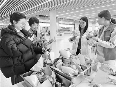在“三八”国际妇女节前夕,宁波大学的女教职工收到了一份别出心裁的节日礼物——由食堂师傅制作、学生包装的“馒头花束”。图为教师们纷纷用手机记录美丽的“馒头花束”。