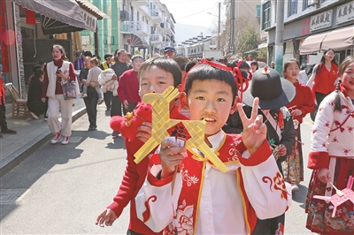 3月11日,安吉县报福小学举办“行走的非遗课堂”活动。学生手持寒假期间精心制作的马年主题手工作品,身着传统汉服,在舞龙舞狮的锣鼓声中走出校园、走上老街,让传统文化在乡村街道上“活”了起来。图为学生展示亲手制作的竹编小马。