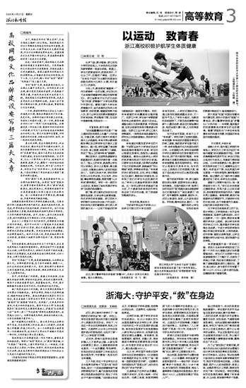 今年2月,教育部将“健康第一”作为新春第一会的主题,并印发《关于全面推进健康学校建设的指导意见》。浙江省教育厅也于近日启动“活力校园 浙青健行”大学生体质提升专项行动。着眼于提升大学生体质健康水平,省内各高校近年来从体育教学、活动竞赛、健康指导等方面入手,努力让学生在校期间掌握更多的体育技能、养成锻炼习惯,在运动中强健体魄、向阳成长——