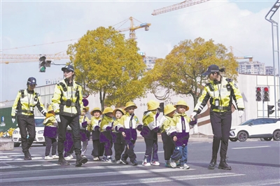 第11个全民国家安全教育日来临之际,湖州开发区实验幼儿园组织春游活动,邀请市公安局交通管理支队的3位铁骑女警护行。女警身着荧光制服,在路口疏导交通、引导车辆减速避让,牵起幼儿的小手,护送他们安全穿过斑马线。在幼儿顺利通过马路后,女警还引导他们念起交通安全小口令,用温柔与责任筑起安全防线。
